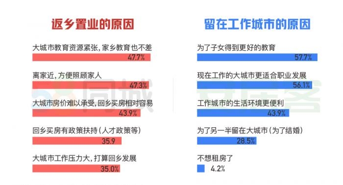 报告显示,对于返乡置业还是在工作城市扎根,人们考虑最多的都是子女的教育问题,其中持返乡置业观点的人群中有47.7%表示“大城市教育资源紧张”,而希望留在工作城市的人群中有57.7%是为了“子女得到更好的教育”。此外,照顾家人等也是人们决定是否返乡置业的重要因素。