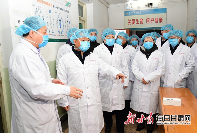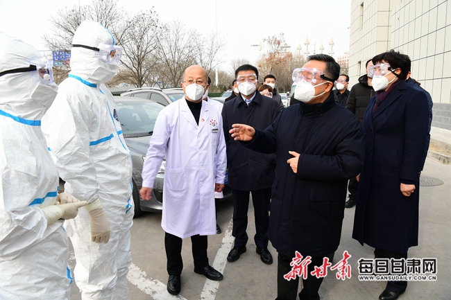 兰州市肺科医院和兰州大学第一医院,是我省确定的新型冠状病毒感染的肺炎诊治定点医院。唐仁健先后来到两家医院的预检分诊点分诊处、发热门诊及隔离治疗病区,详细了解了预检分诊流程和消毒隔离措施有关情况。他强调,疫情就是命令,病房就是战场。要充分认识疫情防控的复杂性、严峻性,坚持“依法”“科学”的原则,严格按照国家卫生健康委下发的《诊疗方案》规定标准,遵守医疗规程,准确通报信息。要在已有成熟经验的基础上,根据新形势、新情况,把每个环节、每个细节再细化再强化,最大限度减少疫情传播的机率概率。要加强对医务人员的培训和应急演练,确保准确掌握诊断标准和报告程序。他叮嘱在场的医务人员,防控疫情任务光荣、使命重大,要在恪尽职守的同时做好自我保护,严格控制医院感染,坚决打赢打好这场硬仗。