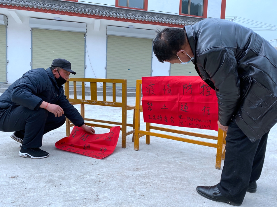 离三岔村不远的秦岭村书记马玉良刚巧在三岔村口接养蜂技术人员和记者,看到三岔村村民正忙着,他赶忙搭了把手,将红纸贴在了马路边上新搭建的一个应急牌上。 马书记告诉记者,大年三十,他收到了一条这样的微信:听卫生健康广播,看疫情防控信息,居家团圆过春节,微信一样能拜年。“看到这条微信后,我赶忙给亲朋好友都转发了一遍,并嘱咐他们发到朋友圈里,让更多的人看到。”马书记说:“从年三十到现在,无论从电视还是网上,随时都能看到有那么多的医护人员为了保障人民的健康不能回家过年,奋斗在一线。我们也应该对自己的健康负责,按照防控新型冠状病毒感染的肺炎疫情的需要,不参加社火表演、不走亲访友等集体活动,居家欢度春节,用发微信、视频聊天、打电话等方式相互拜年。”