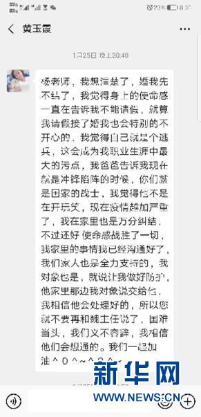 “就算我请假结了婚,我也会特别不开心的。我会觉得自己就是个逃兵,这会成为我职业生涯中最大的‘污点’。”看着同事们纷纷请战,黄玉霞也有些迫不及待。“从事这份职业,心里总有个声音在告诉你,大家都上了,自己不能退缩,此刻正是国家需要我们的时候。”她说。