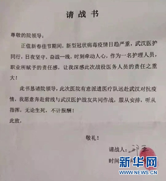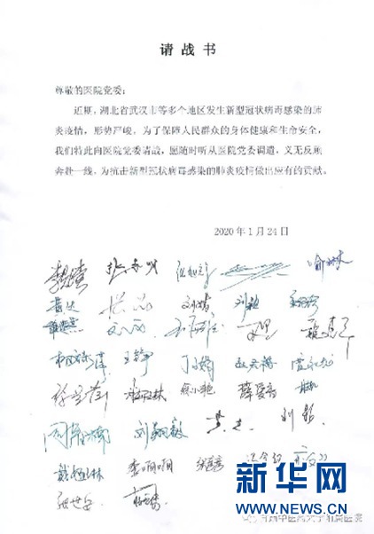 连日来,甘肃省各地医护人员的“请战书”在网络刷屏。“只要有需要,我愿随时奔赴武汉,为抗击肺炎疫情奉献自己的力量。”除夕夜里,甘肃中医药大学附属医院重症医学科主任王昱签上自己的名字,主动向医院党委递交了“请战书”。