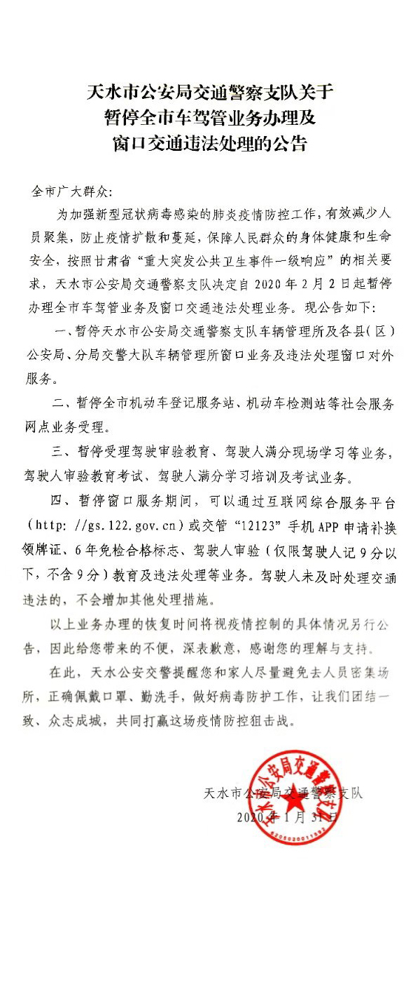 为加强新型冠状病毒感染的肺炎疫情防控工作,有效减少人员聚集,防止疫情扩散和蔓延,保障人民群众的身体健康和生命安全,按照甘肃省“重大突发公共卫生事件一级响应”的相关要求,天水市公安局交通警察支队决定自2020年2月2日起暂停办理全市车驾管业务及窗口交通违法处理业务。现公告如下: