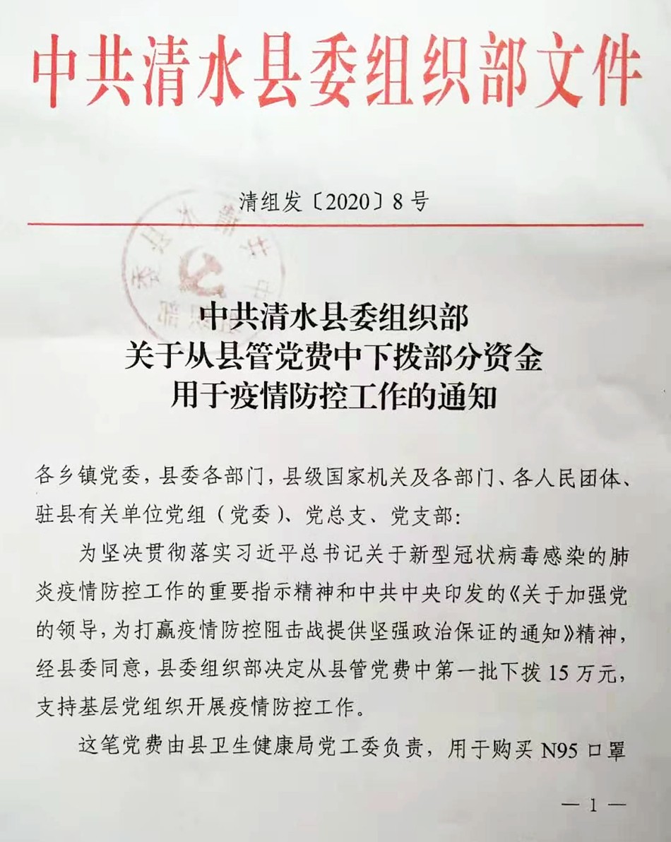 为坚决贯彻落实习近平总书记关于新型冠状病毒感染的肺炎疫情防控工作的重要指示精神和中共中央印发的《关于加强党的领导,为打赢疫情防控阻击战提供坚强政治保证的通知》精神,经县委同意,清水县委组织部从县管党费中第一批下拨15万元,由县卫生健康局党工委负责用于购买口罩等疫情防控物资,全部配发给奋战在疫情防控一线的基层干部和村组干部,支持基层党组织开展疫情防控工作。
