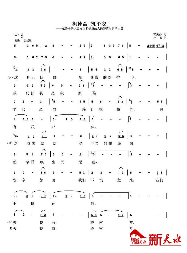 “天使白,警察蓝,我们携手共克时艰,守着你的使命你的战线,有我们群众才安安全全。警察蓝,天使白,我们并肩奔赴一线,守着我的使命我的誓言,有我们人民才平平安安。”2月9日,由秦州区文联主席左昊苏作词,青年作曲家、秦州区音乐家协会副秘书长高小七作曲的原创歌曲《担使命 筑平安——献给守护人民安全和健康的人民警察与医护人员》正在紧张地进行音频制作。