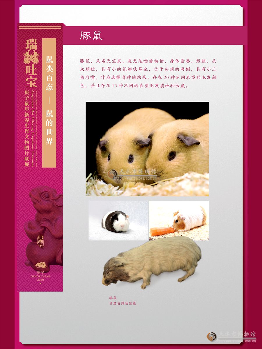 1月22日,瑞鼠吐宝——庚子鼠年新春生肖文物图片联展在天水民俗博物馆开展了。该展览由中国文物报社联合34家文博机构共同推出,展览从全国50多家文物单位,甄选了数百件以鼠为题材的文物、艺术品和珍贵标本,以及其他生肖文物,向广大公众奉上图文展览。展览设在天水民俗博物馆北宅子展厅,展期2个月。