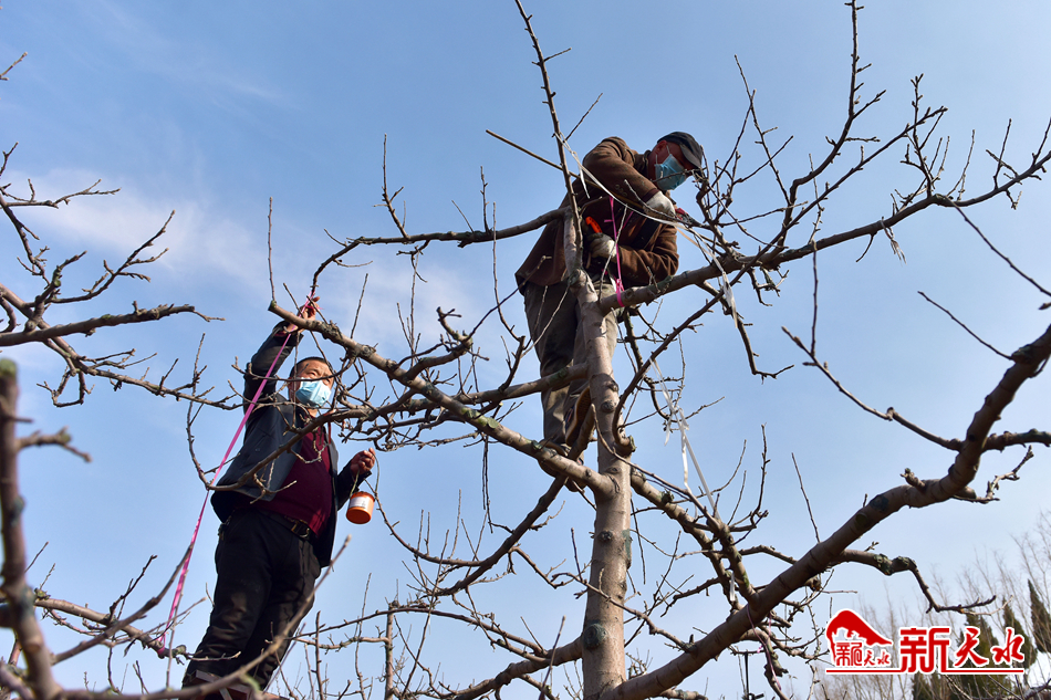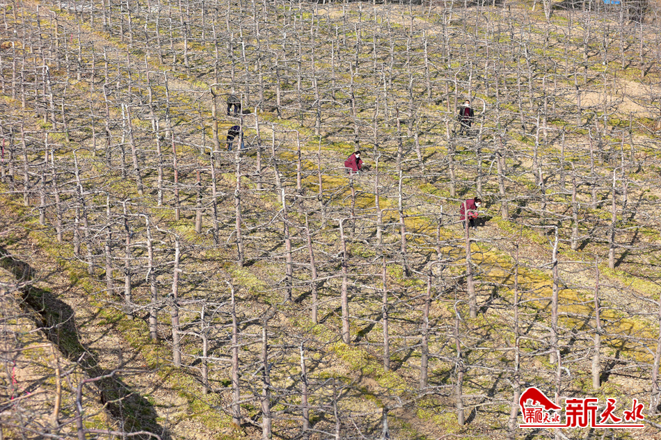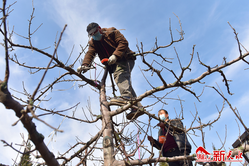 2月13日,麦积区南山万亩花牛苹果基地,农民正在修剪果树。