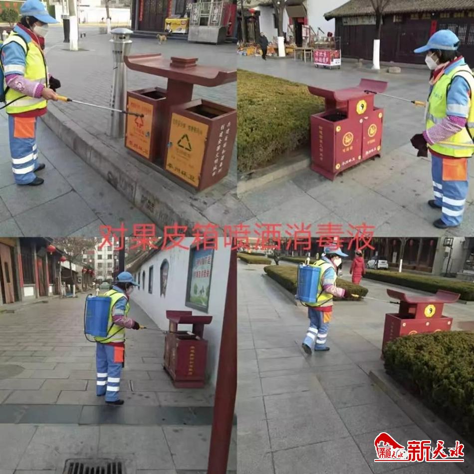 1月25日开始,该中心为各部门发放了消毒液及喷洒设备,首先对人群容易聚集的龙城广场、中华东西路步行街、伏羲城步行街、天水湖、成纪儿童公园等城市重点公共区域进行喷洒消毒,对城区所有垃圾桶、果皮箱、垃圾堆放点、清运车、公厕等开展全面及时消毒工作。安排专人对400余个垃圾点清运点、1200个果皮箱进行喷洒药物消毒,各环卫所对城区76座公厕每天定时喷洒消毒,在城市重点公共区域设置防护口罩专用收集桶,对防护口罩专用收集桶定时、定点和专门收集,严禁与生活垃圾混合,防止废弃口罩等防控物品二次污染。同时建立台账,值班领导及人员坚持督查,抓好消毒工作的督促落实。1月31日,该中心召开新型冠状病毒肺炎疫情防控工作推进会,强化疫情防控工作,强调对一线环卫工人的保护措施,进一步增强他们的环境意识和消毒次数,确保每天对环卫设施消杀4次。