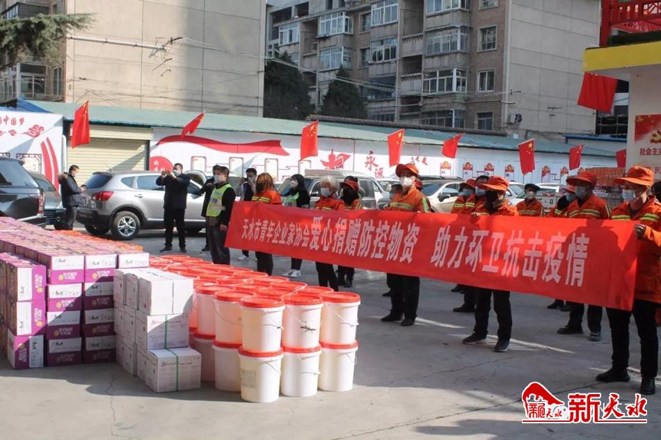 2月4日,天水宝康医药连锁有限公司向秦州环卫无偿捐赠次氯酸钠溶液400斤,支援疫情防控;2月5日,兰州庄园牧场股份有限公司与天水交通银行天水分行为奋战在环卫一线的人员赠送24箱酸奶,向在刺骨寒风中坚守岗位的环卫工作者表示亲切慰问和衷心感谢;天之水网和爱心人士赵彦来送来170箱牛奶和40提矿泉水;2月8日,罗玉路水果批发市场的王斌果行及爱心人士吴小林捐赠猕胡桃等各类水果共计4吨,向环卫工作者致敬;2月9日下午,在秦州区城乡环境卫生治理服务中心单位院内出现暖心一幕,一位不愿透露姓名的爱心人士为一线秦州环卫工人捐赠橡胶手套2箱共1000双,用于环卫一线疫情防控消杀人员的作业防护;2月10日,爱心人士庞玺捐赠方便面20箱、矿泉水4提;2月10日,秦州区城乡环境卫生治理服务中心举行天水市青年企业家协会助力环卫抗击疫情爱心捐赠仪式。捐赠仪式上,天水市青年企业家协会为秦州区环卫一线的工作人员共捐助40桶84消毒液、40桶酒精、3000双橡胶手套、20套防护服、70箱沙棘汁和150箱方便面等物资,支援环卫一线工作。慷慨解囊、雪中送炭,支援环卫一线,所有的捐助都充分彰显了社会各界人士强烈的社会责任感和大爱无疆的奉献精神。而在这个抗击疫情的特殊时期,奋战在秦州环卫一线的环卫工人橘红色的身影显得格外亮眼。是他们,为抗击新型冠状病毒肺炎疫情构筑了一道坚实的“环卫防线”。