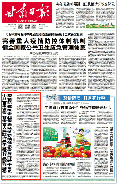 中共甘肃省委 甘肃省人民政府关于坚决打赢新冠肺炎疫情防控阻击战促进经济持续健康发展的若干意见