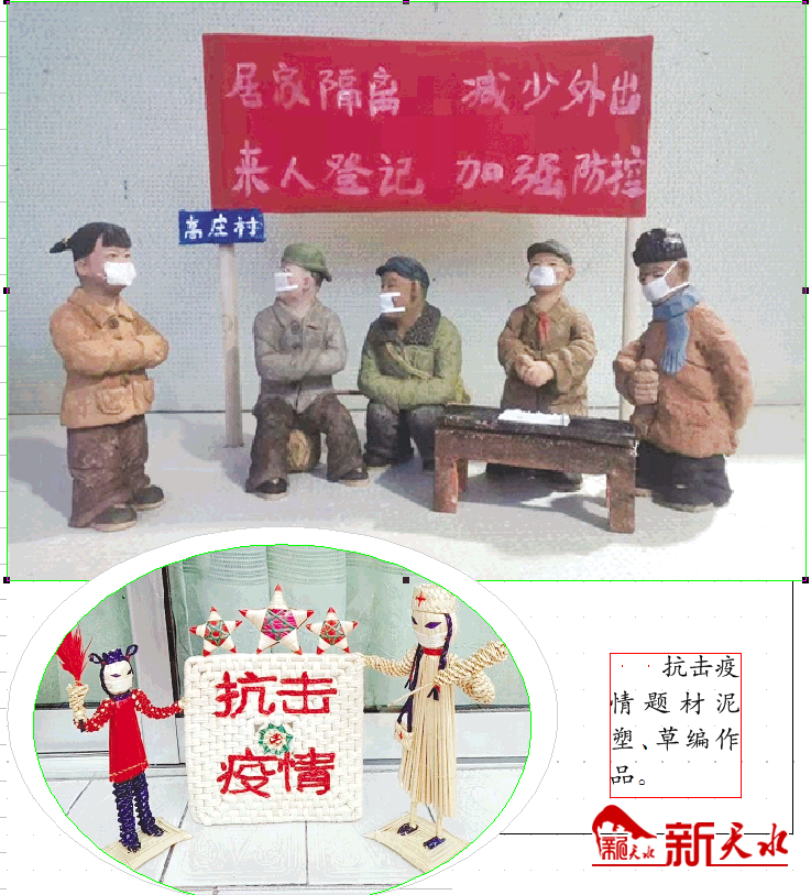 由李玉进和杨春晓总策划、陈建中策划、牛勃创作、天水市文化和旅游局和天水市文化馆出品、天水市文化馆公益朗诵团成员朗诵的一首大型诗歌诵读的音频《饺子,为你留着》迅速传遍天水朋友圈,诵者的深情让听众为之动容。天水市歌舞团副团长、天水市音乐家协会副主席、国家二级演员张文静演唱战“疫”颂歌《人间大爱》,国家二级演奏员、市音乐家协会副主席姚德明,文学界人士温旭兵、闫武装、剑虹等人在短短几天内共同创作写成《齐心协力保国安》、《送瘟神》等6首歌曲,赞美抗击疫情一线工作者,表达万众一心抗击疫情的决心。张家川县文化馆发挥自身优势,号召全县文艺工作者和爱好者积极创作抗击疫情的文艺作品,用作品致敬白衣天使和一线英雄,激励广大人民群众万众一心,共同努力,为武汉加油,为中国加油,全力打赢疫情防控阻击战。市级非遗名录项目“麦积泥塑”代表性传承人、中级工艺美术师王子斌,近日创作出了以“抗击疫情、宣传防控”为主题的5套泥塑作品,作品通过喜闻乐见的形式进行疫情防控宣传;武山刺绣技艺非遗代表性传承人刘云帆,用他独特的方式加入到宣传疫情防控的队伍中来,贡献出自己的力量,为打赢这场疫情防控阻击战加油助力。我市文艺界人士也纷纷写诗写文作曲,通过这种方式来为抗疫出力。