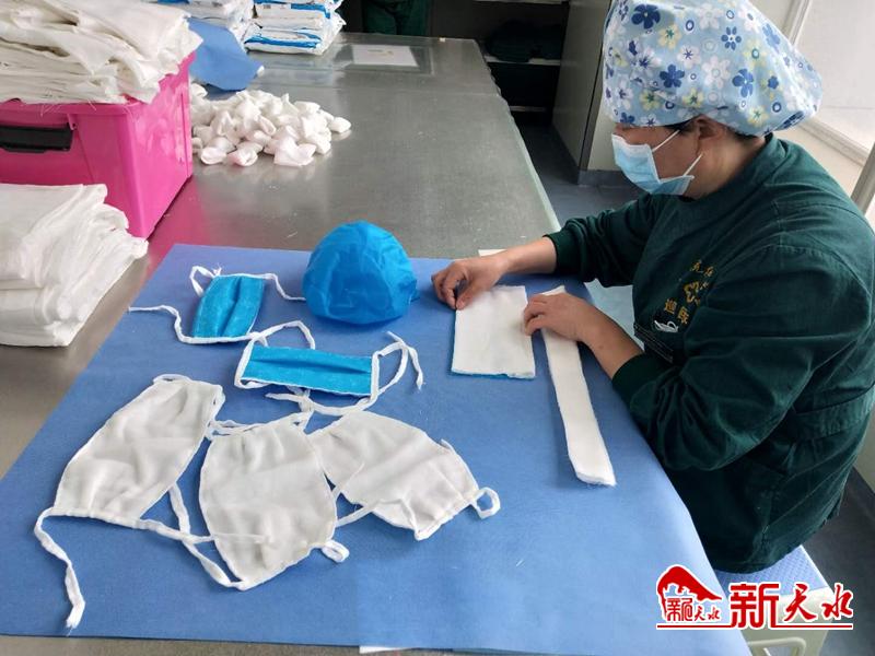 年节当下,疫情阻碍,交通不便,口罩等防护物资异常紧缺,消供人员集思广益,用能防水阻菌的无纺布开始制作一次性口罩和其他物品,下送到科室,保证全院医护人员都有口罩戴。