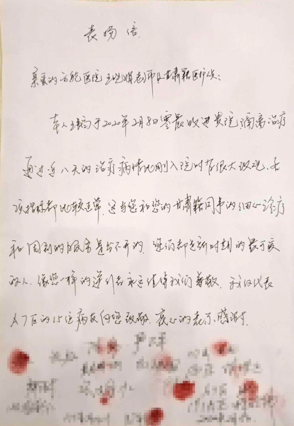 这是武汉城市客厅方舱医院多位患者联名写给甘肃省第二批援助湖北医疗队队员的表扬信。(甘肃省第二批援助湖北医疗队供图)