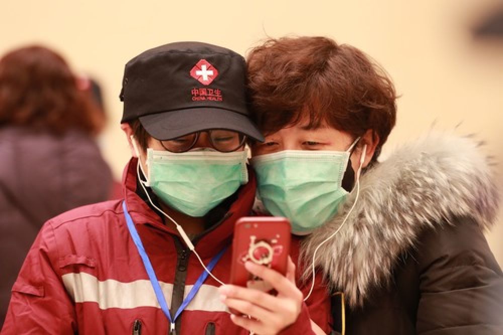 2月4日,甘肃省第二批援鄂护理专业医疗队队员(左)在出发前和家人通视频电话。新华社发(杜哲宇 摄)