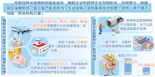 当前,广大企业在严防疫情的前提下有序复工复产,为保障经济社会稳定运行作出了积极贡献,令人备受鼓舞。源于我国基本经济制度的内在优势正在不断释放强大能量。央企和囯企方面,截至2月17日,中央企业所属2万余户生产型子企业复工率超过80%,石油石化、通信、电网电力、交通运输等行业开工率超过95%,有的已达100%,中央企业排头兵作用日益凸显;民企方面,在阿里巴巴、腾讯、百度等龙头企业大手笔捐赠的同时,更多的民营企业则通过迅速复产、转产,加紧调整生产线、改造生产设备,生产疫区紧缺物品。他们不仅靠复工转产进行生产自救,还有力驰援了防疫一线。