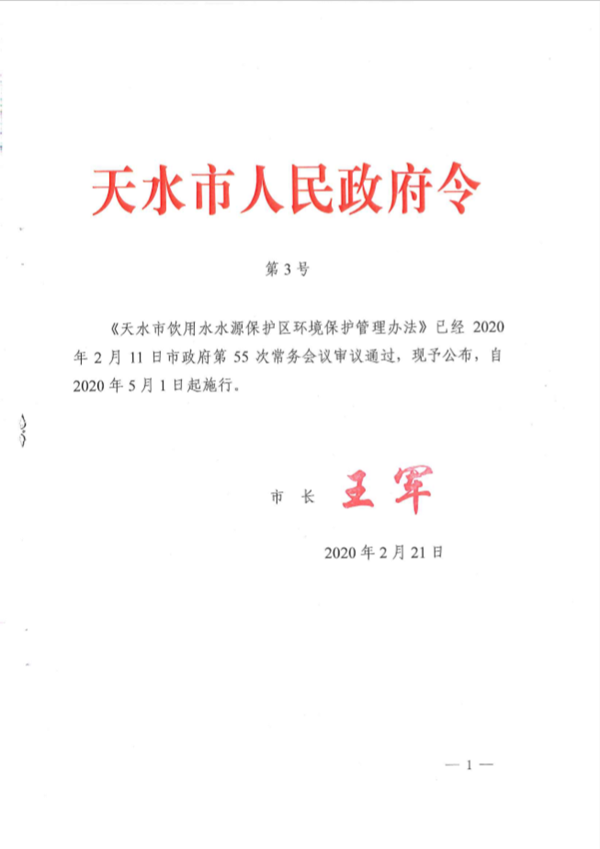 第四十九条本办法自2020年5月1日起施行。2018年3月19日天水市人民政府第2号令《天水市饮用水水源保护区环境保护管理办法》同时废止。