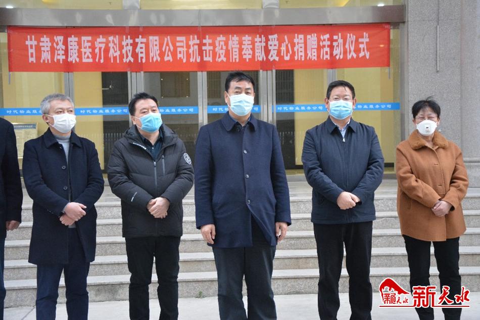 新天水讯【天水日报记者 李欣桐】2月26日下午,甘肃泽康医疗科技有限公司“抗击疫情 奉献爱心”捐赠活动在市红十字会院内举行。市委常委、宣传部部长张建杰为捐赠方颁发捐赠证书;农工党甘肃省委员会副主委李晓霞、副市长逯克宗出席捐赠仪式。