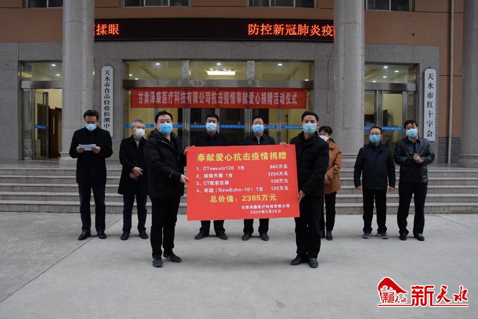 捐赠仪式上 ,甘肃泽康医疗科技有限公司为我市秦安县中医院捐赠CT neuviz128 1台,价值885万元;核磁共振1台,价值1250万元;CT高压注射器及相关配套仪器价值130万元。为清水县中医医院捐赠彩超(NewEcho-10)1台,价值120万元, 捐赠医疗物资共计2385万元。
