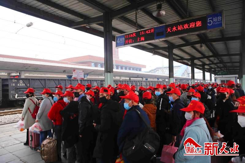 从当日13时30分开始,一批佩戴“甘源人力”小红帽的旅客陆续进站,测温、验票、安检……经过一道道“关口”,到达了他们的“候车专区”。15时42分,承载着204名务工人员的T118次列车从天水火车站缓缓驶出,开启他们返岗复工之旅。