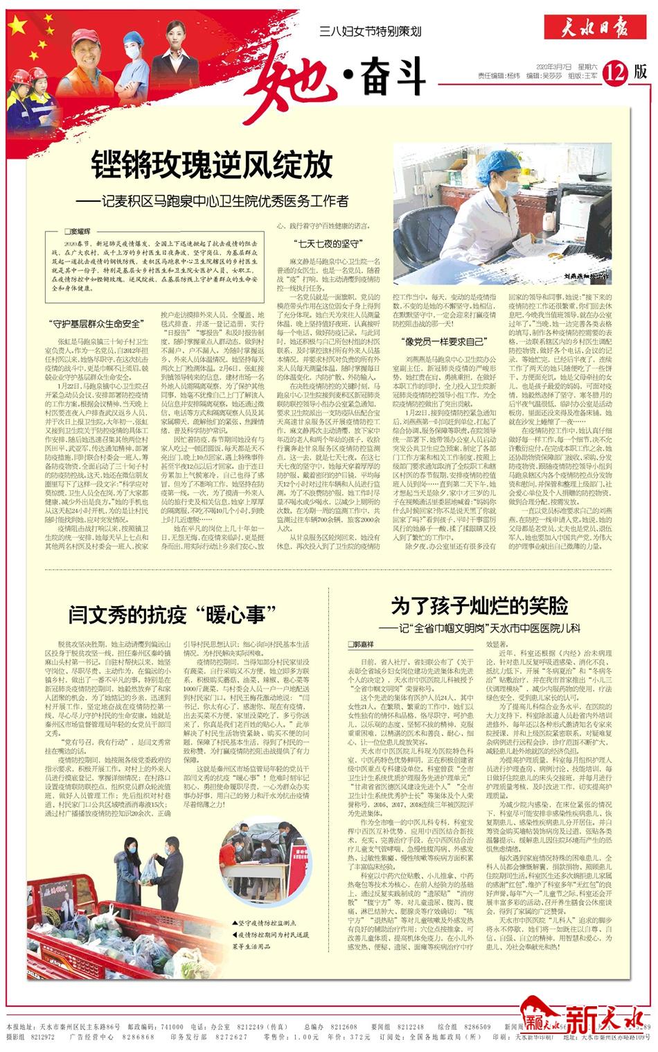 2020春节,新冠肺炎疫情爆发,全国上下迅速掀起了抗击疫情的阻击战,在广大农村,成千上万的乡村医生日夜奔波,坚守岗位,为基层群众筑起一道抗击疫情的钢铁防线,麦积区马跑泉中心卫生院辖区的乡村医生就是其中一份子,特别是基层女乡村医生和卫生院女医护人员、女职工,在疫情防控中如铿锵玫瑰,逆风绽放,在基层防线上守护着群众的生命安全和身体健康。
