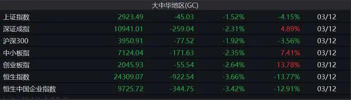 3月12日,沪指跌1.52%报2923.49点;深成指跌2.31%报10941.01点;创业板指跌2.64%报2045.93点。