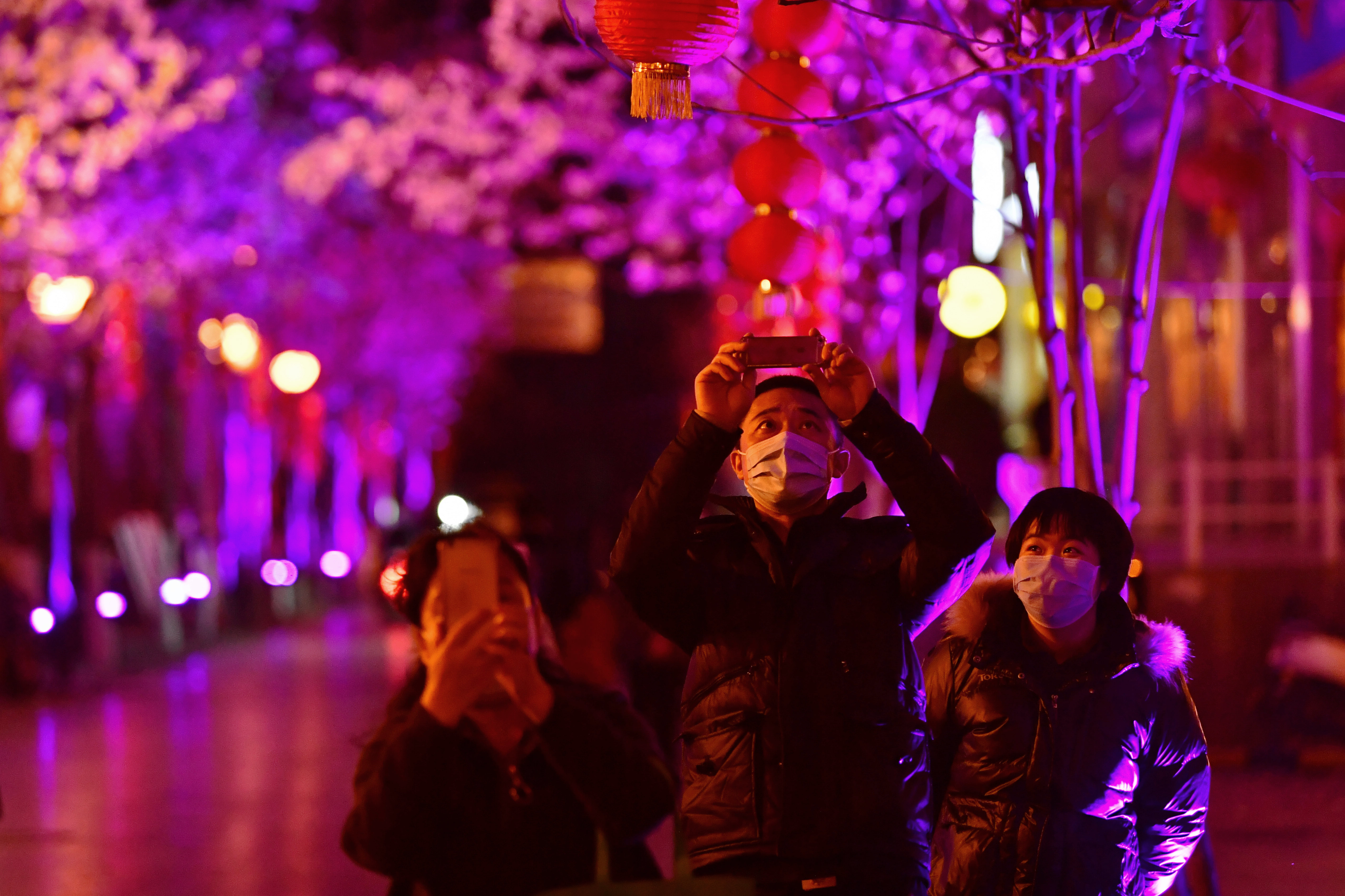 ↑3月12日,行人在甘肃省天水市秦州区自由路的玉兰花下拍照。