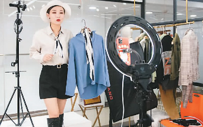 近日,商户聘请的模特在湖南株洲市芦淞欧洲城服饰市场,通过网络直播销售服装。