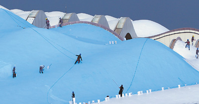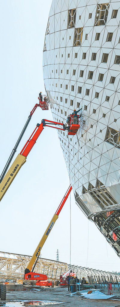 3月15日,第十八届世界中学生运动会主会场福建晋江市第二体育中心各个场馆及室外工程均已全部复工。图为工人在进行主场馆外立面施工。 邵玉姿 董严军摄影报道