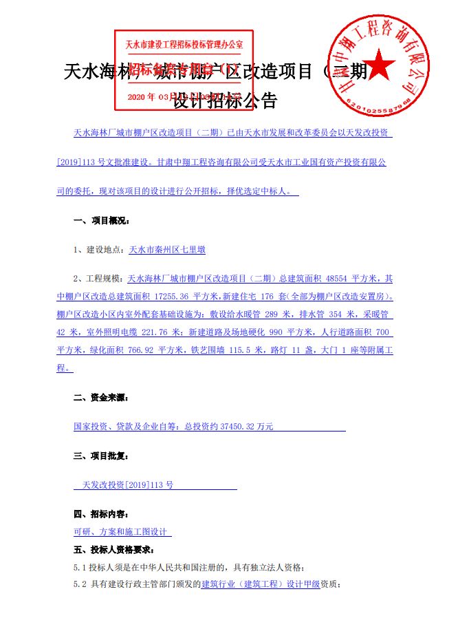 天水海林厂城市棚户区改造项目(二期)已由天水市发展和改革委员会以天发改投资[2019]113号文批准建设。