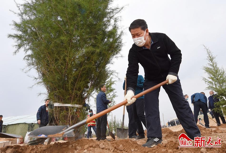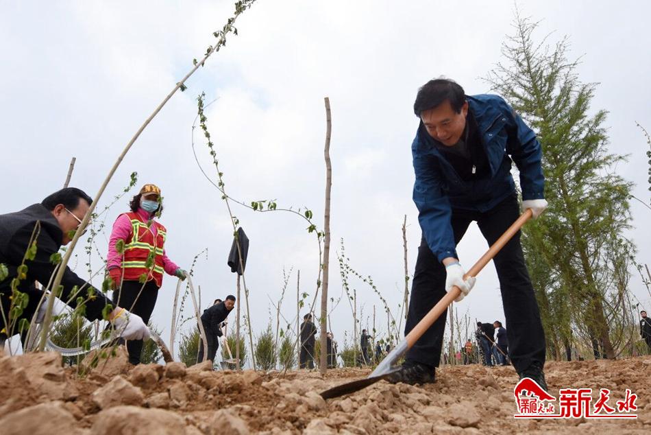 春日的天水大地,草木吐绿、万物勃发。王锐、蒋晓强、王军、赵卫东等来到植树点,与干部群众一起挥锹铲土、扶苗围堰、提水浇灌,植树现场一派热火朝天的劳动景象。
