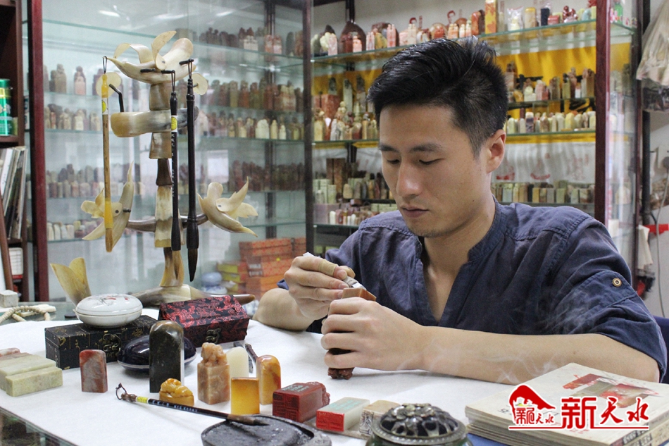 正当张国标篆刻技艺精进的时候,由于一些客观原因,他放弃了在西安发展的机会,在辗转准备到兰州发展的过程中,从车站地图上看到了天水麦积山,抱着游玩的态度来天水的一次停留,让他在这里扎下了根。当时是2005年,麦积的仿古文化一条街正在招商,商铺价格很便宜,环境也很好,既可以经营毛笔等书画用品,在有一定的经济收入的同时,也可以努力研究和探索篆刻艺术的技巧和风格。