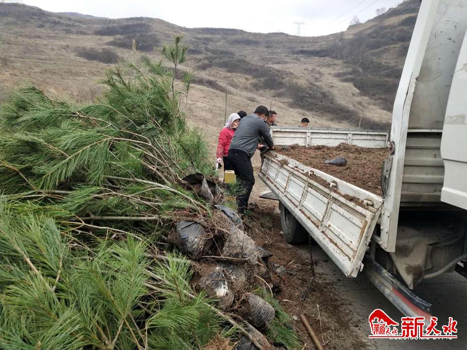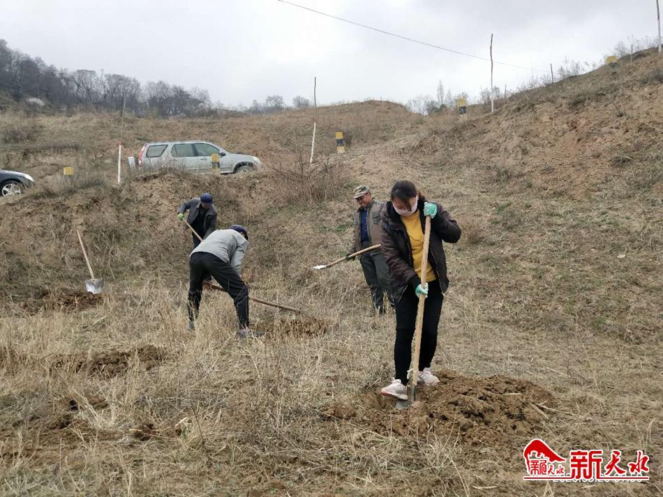 3月21日一大早,秦州区天水镇马莲山山梁上,红旗招展、人声鼎沸,来自周边五六个村庄的村民在党员干部的带领下正在打点、挖坑。