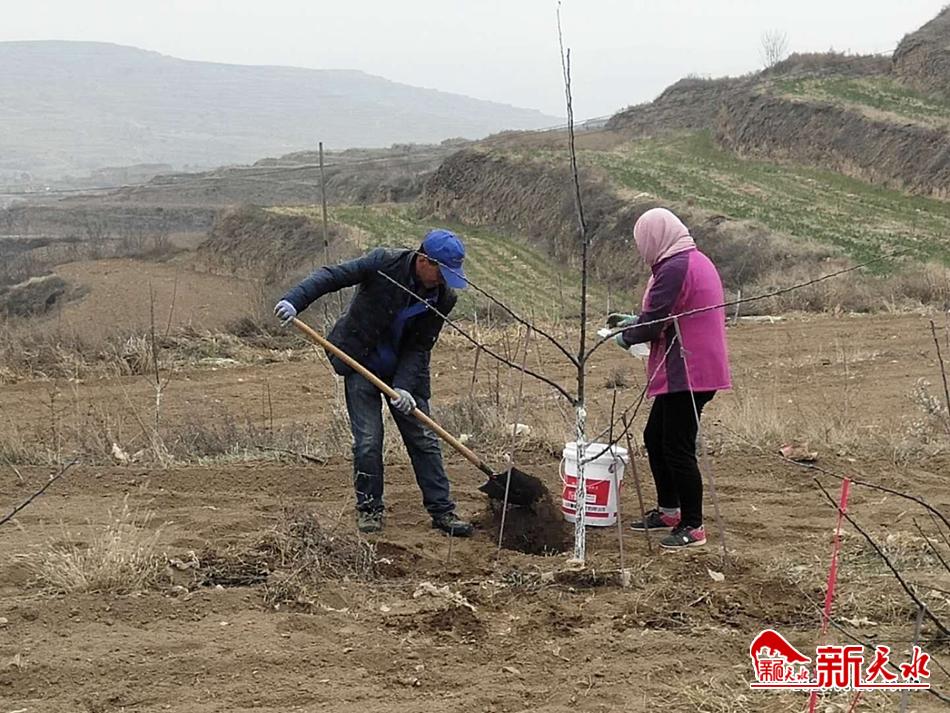 天水镇石徐村贫困户徐玉平两口子从正月初十开始就一直在晟源合作社的果树建园点上,从打点放线、挖坑、栽树,再到现在的拉树枝,他们一直忙碌着没停歇过。