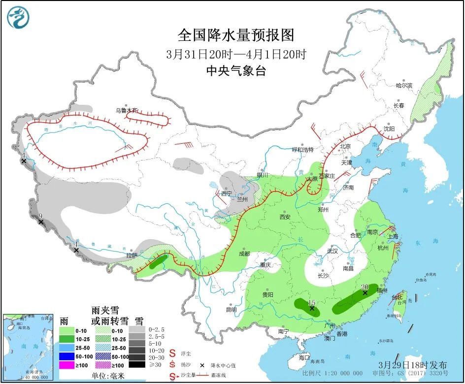 3月31日,河西五市多云,祁连山区阴有小雪(雨);省内其余地方多云或阴,部分地方有小雨(雪)。另外,酒泉、嘉峪关两市有4-5级偏东风。