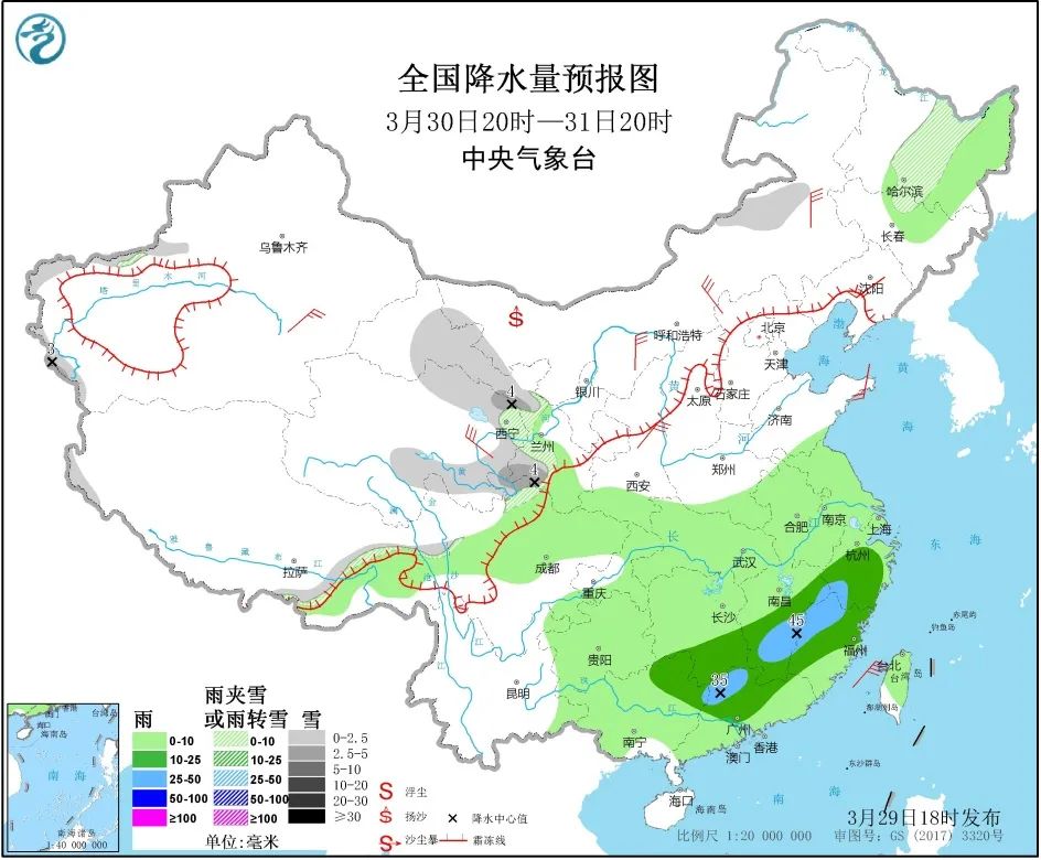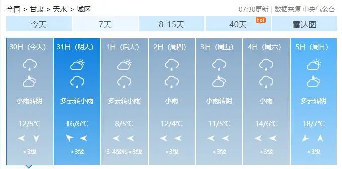 3月30日,甘南、临夏、定西、陇南、天水等州市多云转阴有小雨(雪),其中甘南州局部地方及定西市南部有中雪;河西五市多云,有4-5级西北风,祁连山区阴有小雪(雨);省内其余地方晴或多云。