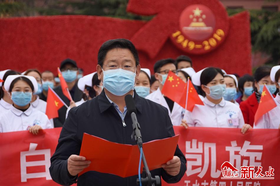 王锐说,面对突如其来的疫情,天水驰援武汉医护人员坚决响应习近平总书记和党中央号召,主动请缨、逆行出征,与武汉人民并肩作战,与新冠病毒正面交锋,不负重托,不辱使命,圆满完成了救治任务。过去的两个多月,你们不顾危险、忘我工作,同时间赛跑、与病魔较量,发扬大爱无疆、医者仁心的崇高精神,克服了很多前所未有的困难,为夺取武汉保卫战、湖北保卫战的胜利作出了重要贡献,展示了天水医护人员良好的精神风貌。你们不愧是新时代最可爱的人,天水人民为你们自豪,以你们为荣!