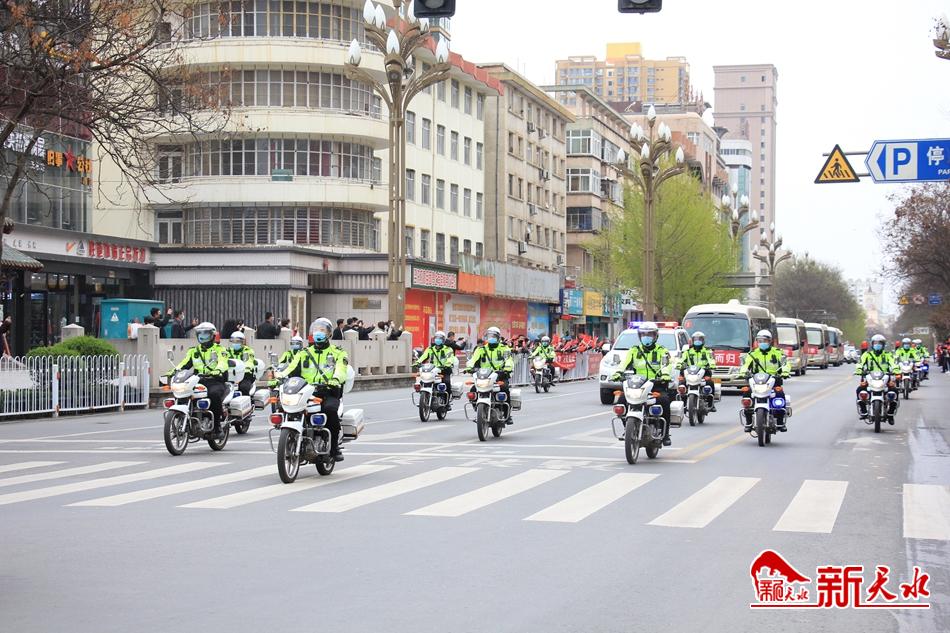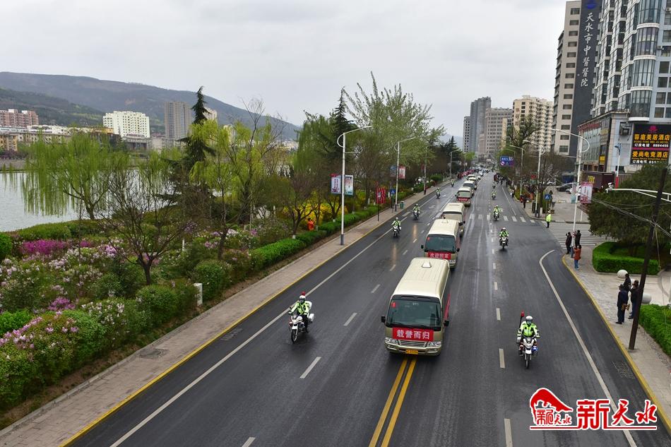 最高的礼遇,最深的敬意。进入天水后,医疗队员们乘坐的车辆由20辆警用摩托车开道护送,经秦州区瀛池大桥、藉河北路、新华路南段、建设路、民主路,最后抵达龙城广场。在那里,参加全市人民为他们举行的欢迎仪式。