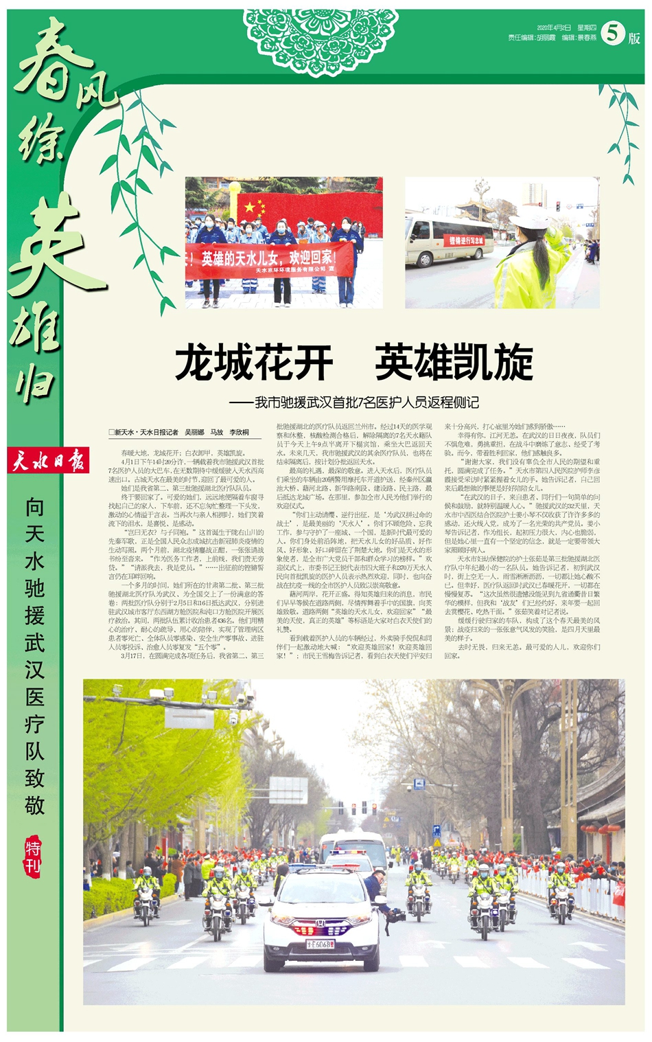 藉河两岸,花开正盛。得知英雄归来的消息,市民们早早等候在道路两侧,尽情挥舞着手中的国旗,向英雄致敬。道路两侧“英雄的天水儿女,欢迎回家”“最美的天使,真正的英雄”等标语是大家对白衣天使们的礼赞。