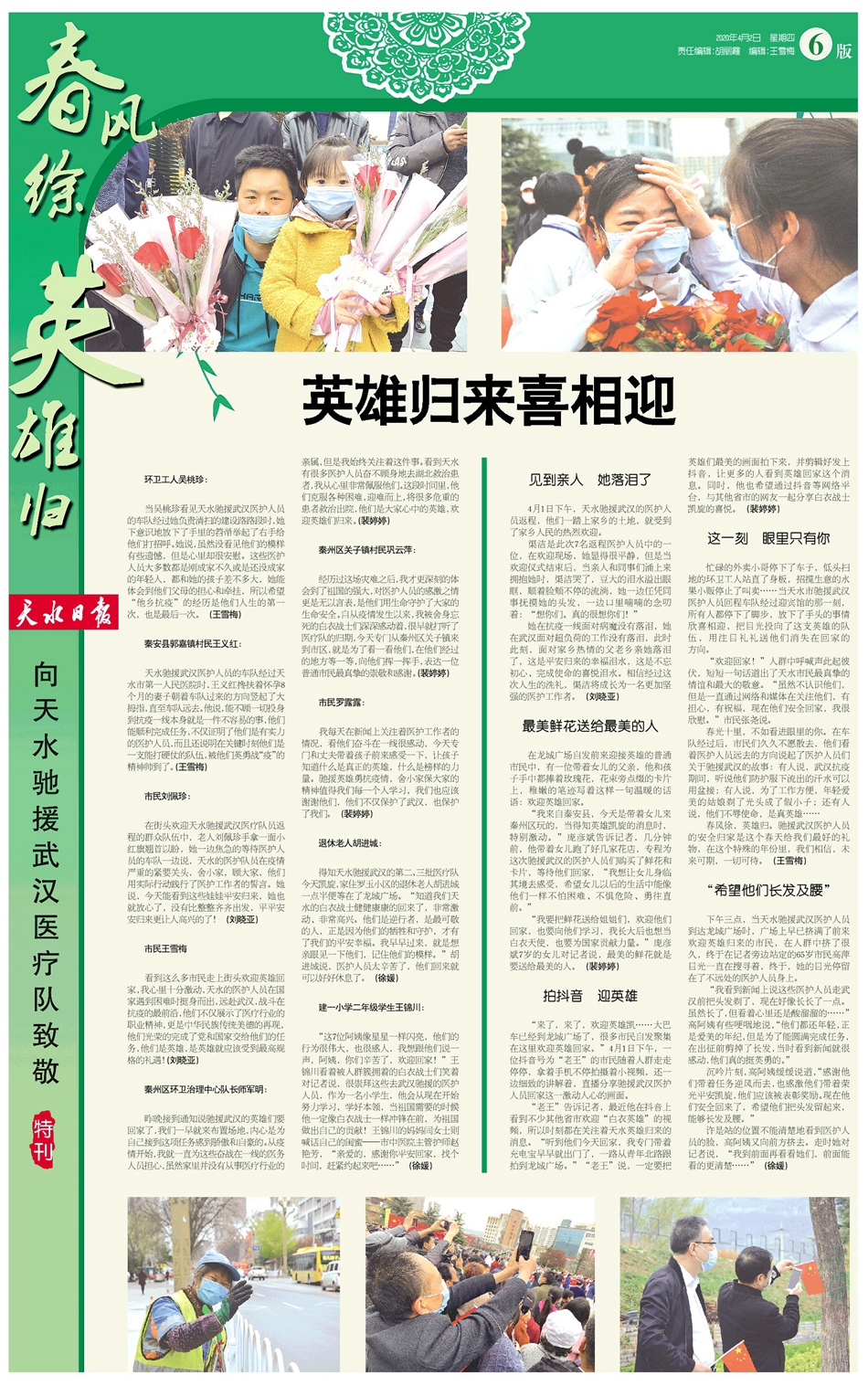 看到这么多市民走上街头欢迎英雄回家,我心里十分激动,天水的医护人员在国家遇到困难时挺身而出,远赴武汉,战斗在抗疫的最前沿,他们不仅展示了医疗行业的职业精神,更是中华民族传统美德的再现,他们光荣的完成了党和国家交给他们的任务,他们是英雄,是英雄就应该受到最高规格的礼遇!(刘晓亚)