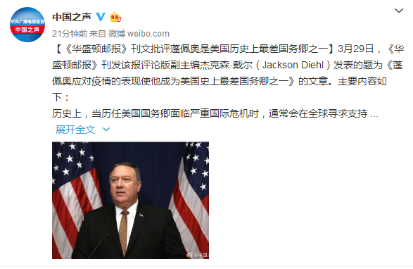 3月29日,《华盛顿邮报》刊发该报评论版副主编杰克森·戴尔(Jackson Diehl)发表的题为《蓬佩奥应对疫情的表现使他成为美国史上最差国务卿之一》的文章。主要内容如下: