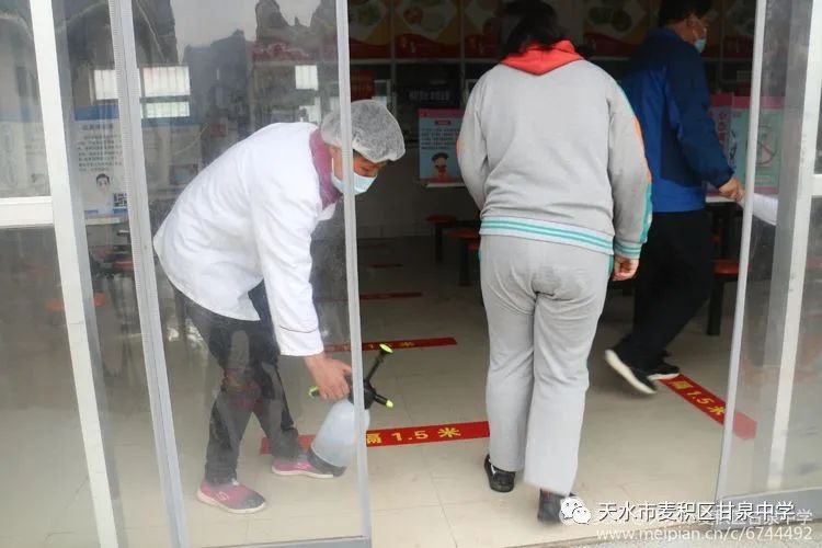 餐厅消毒人员给师生依次消毒