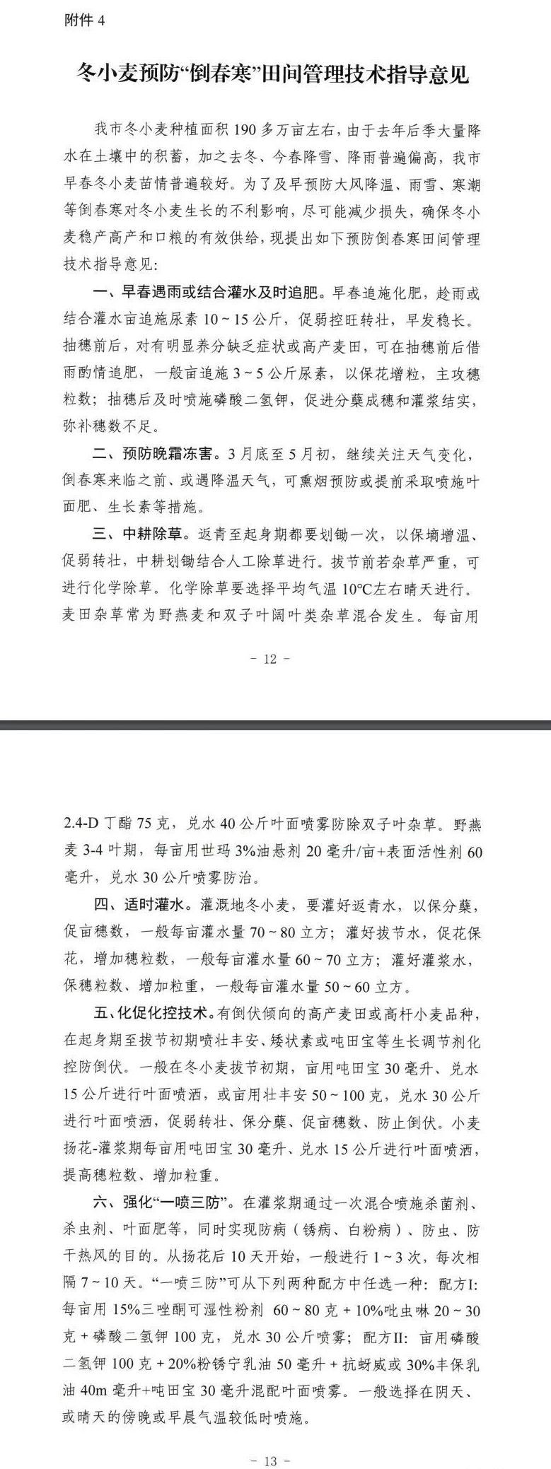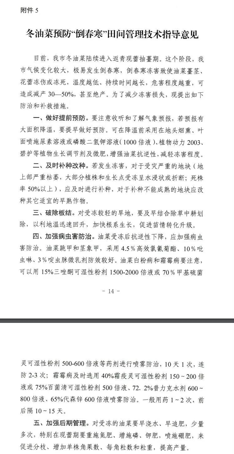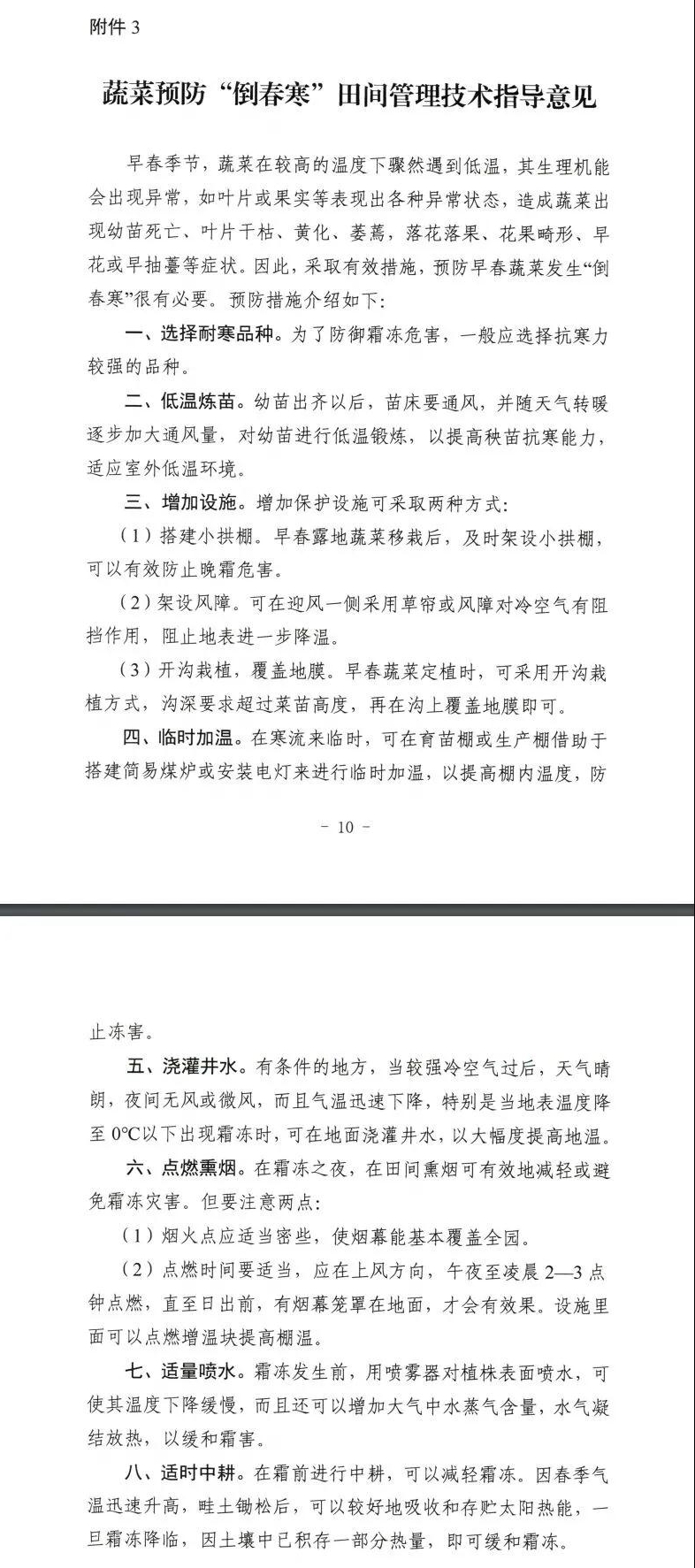 三、落实防范措施。要根据《低温冻害气象信息专报》对策建议,密切关注天气变化,及时组织动员群众采取烟熏、开启防霜机、喷施营养液等果园防霜冻措施,积极防范应对此次低温冻害天气。同时,要按照蔬菜、冬小麦、冬油菜等预防早春“倒春寒”田间技术指导意见落实好各项防范措施。