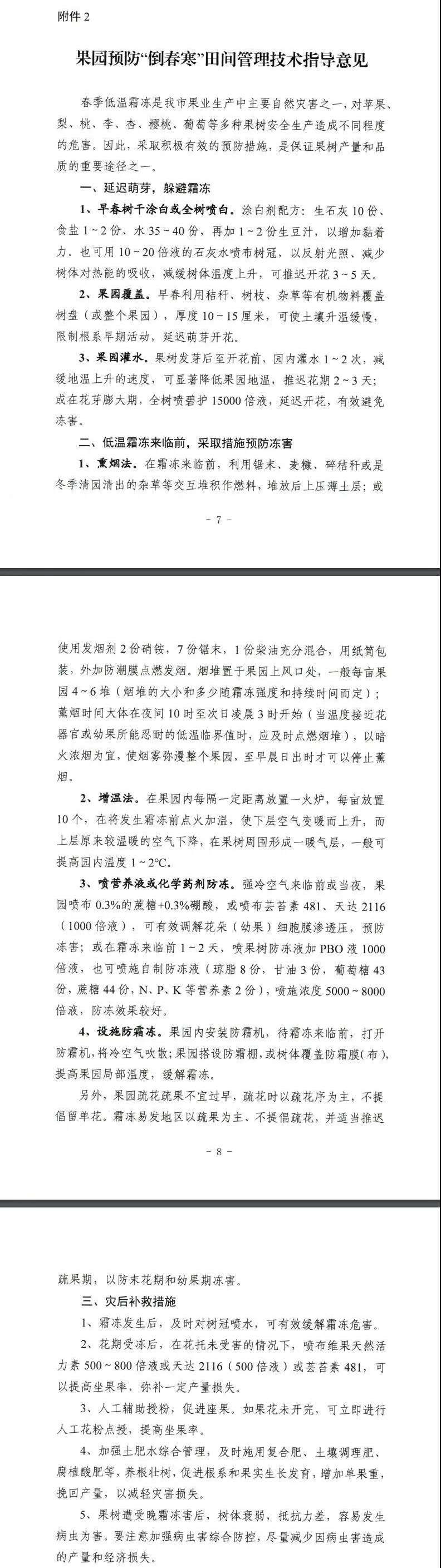 四、强化技术指导。要结合千名农业科技人员服务农业生产助推稳定脱贫活动,及时组织农技人员深入生产一线,指导农民群众科学积极主动采取应对防范措施,落实好各项防灾减灾技术,提升果园和春季农作物田间管理水平,提高防灾减灾能力,尽力将灾害损失降到最低。
