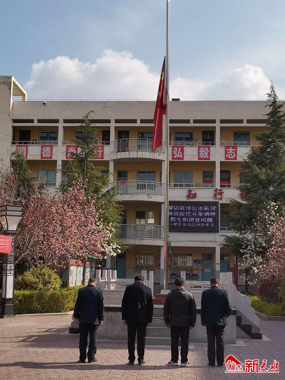新天水讯【天水日报特约记者王建军 特约通讯员董晓峰】2020年4月4日10:00-10:03,全国举行哀悼活动,深切哀悼抗击新冠肺炎疫情斗争中牺牲的烈士和逝世的同胞。甘谷县各学校也通过下半旗志哀和现场默哀等形式,组织师生深切哀悼抗击新冠肺炎疫情斗争中牺牲的烈士和逝世的同胞。