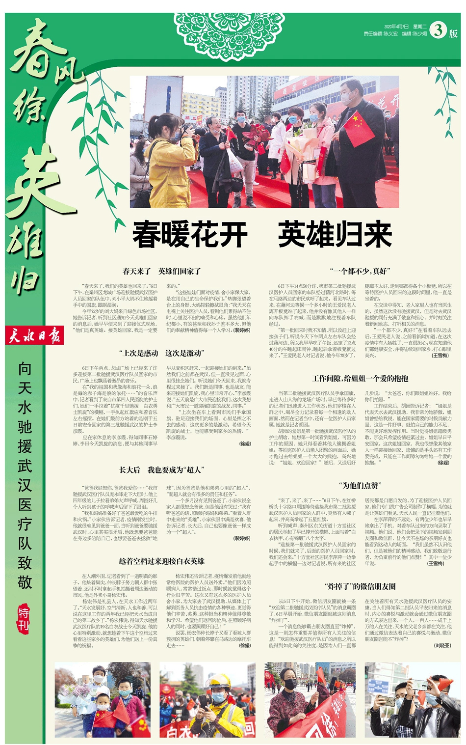 “春天来了,我们的英雄也回来了。”6日下午,在秦州区龙城广场迎接驰援武汉医护人员回家的队伍中,刘小平大妈不住地摇着手中的国旗,眼眶湿润。
