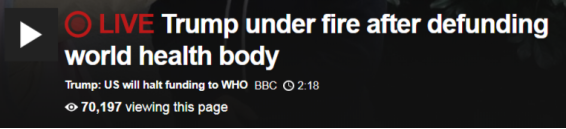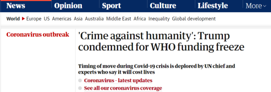 英国广播公司报道称,美国是全球新冠病毒确诊和死亡人数最多的国家,有超过60万人感染,死亡病例超过2.6万。特朗普暂停向世界卫生组织缴纳会费,借此转移民众对自己应对疫情不力的批评,试图遏制中国日益增长的国际影响力。