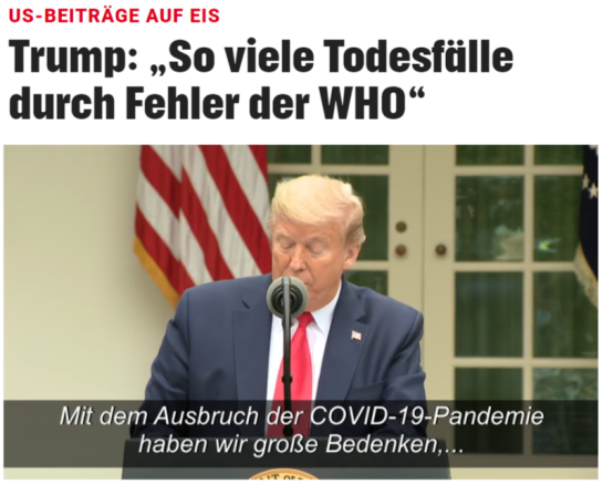 奥地利《皇冠报》报道,特朗普针对世卫组织可能是转移自己的错误。长期以来,美国共和党一直低估新冠病毒的风险,直到3月初,特朗普都坚持病毒对美国没有任何影响,并坚决反对对其“行动慢”的指责。