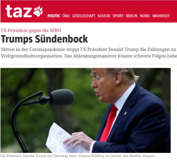 德国全国性报纸《日报》发表题为《特朗普的替罪羊》的文章称,美国出现新冠疫情以来,特朗普将中国和美国民主党当成替罪羊,现将怒火撒向世卫组织,此举可能带来严重后果。当前的危机中,世卫组织应受到各界广泛的资助,特朗普此举将动摇世卫组织的根基。特朗普似乎并不在乎国际的反响,而只在意自己的形象和大选中顺利连任。