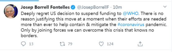 欧盟外交与安全政策高级代表博雷利15日在其社交媒体表示,对美国停止对世卫组织资金支持的行为表示深深的遗憾。此时没有任何理由能为这个决定进行辩护,现在比任何时候都需要美国在全球抗疫方面作出努力,只有共同合作我们才能战胜这场没有国界的危机。