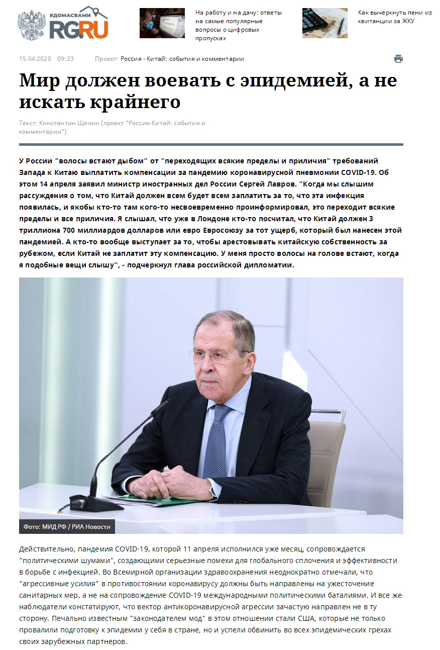 《俄罗斯报》网站15日在《中俄锐评》专栏中刊发《世界应共同抗疫而不是推诿甩锅》的评论文章,尖锐揭批美国借疫情对中国种种甩锅和污名化做法,力挺中国抗疫努力和国际合作,积极赞赏“人类命运共同体”理念。俄新社、RT电视台等俄主流媒体纷纷转载该篇文章,引发广泛关注。