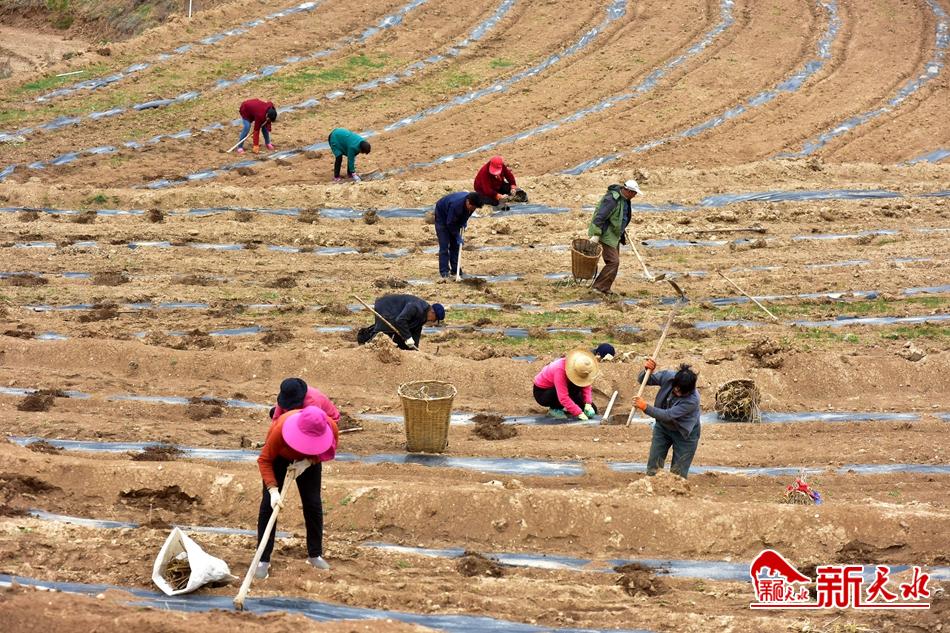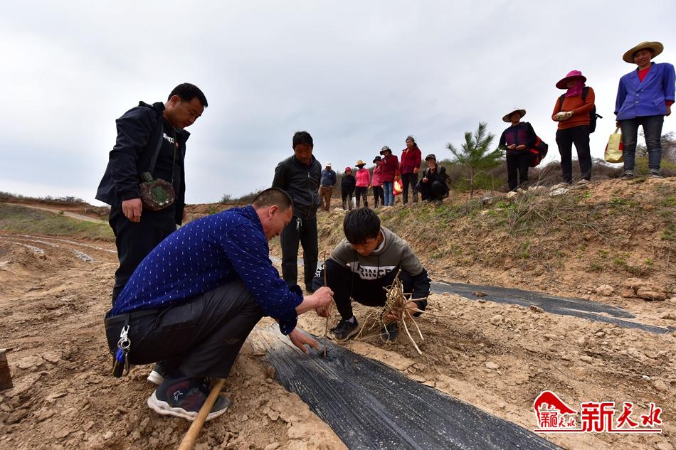 4月10日中午,在汪川镇双集村乌龙头基地,区农业局果业发展中心工程师刘永强正在向来这里栽植乌龙头苗的群众进行现场教学。“每株之间要相距一米,苗子栽下去后培土时要提一提,然后用土盖在苗子周围……”刘永强一边讲解,一边示范,不一会儿,周围的群众就掌握了要领,分散到各个地块进行乌龙头苗的栽植。